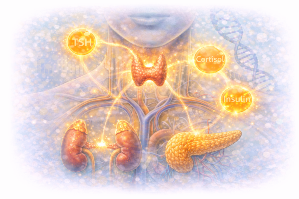 An illustration depicting endocrine glands and hormones involved in metabolic regulation. Disruptions in hormonal signaling—such as thyroid function, cortisol regulation, and insulin balance—may influence cellular energy and overall metabolism.