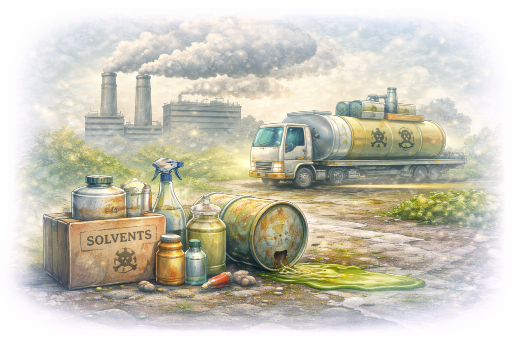 An illustration depicting potential environmental exposures such as industrial pollutants, chemical solvents, and airborne contaminants that may contribute to biological stress.