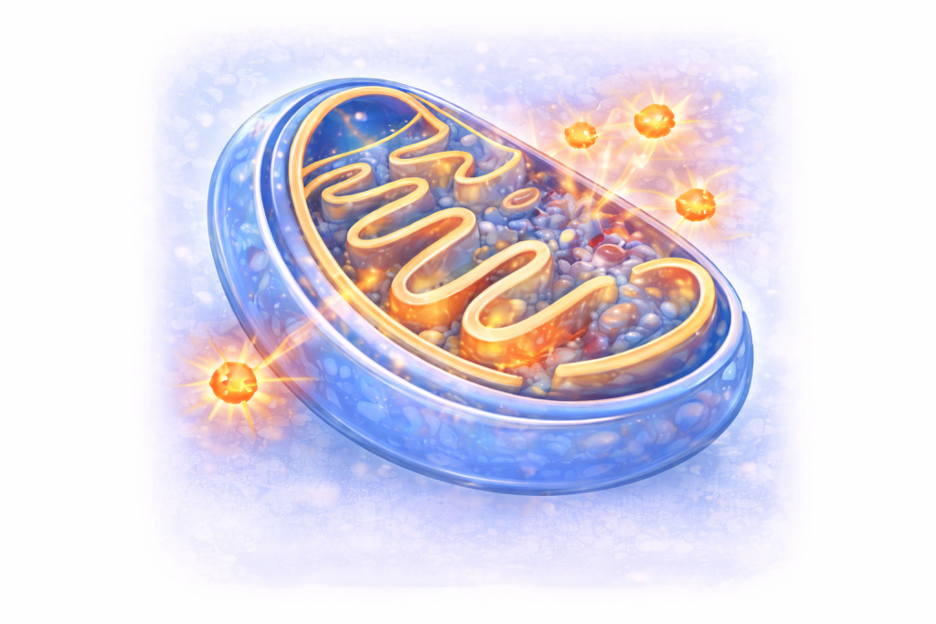 Illustration of mitochondrial stress and oxidative damage affecting cellular energy production.