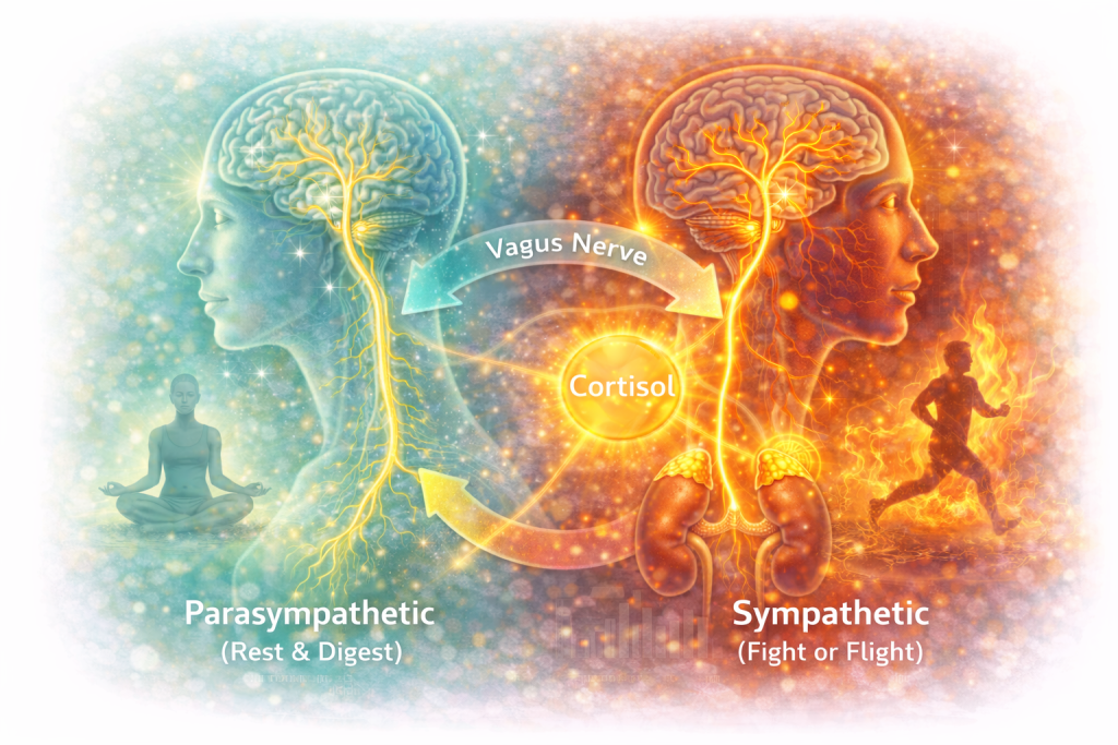 An illustration depicting the autonomic nervous system, including the balance between parasympathetic “rest and digest” activity and sympathetic “fight or flight” responses. Prolonged stress activation may influence hormonal signaling, inflammation, and the body’s overall energy regulation.