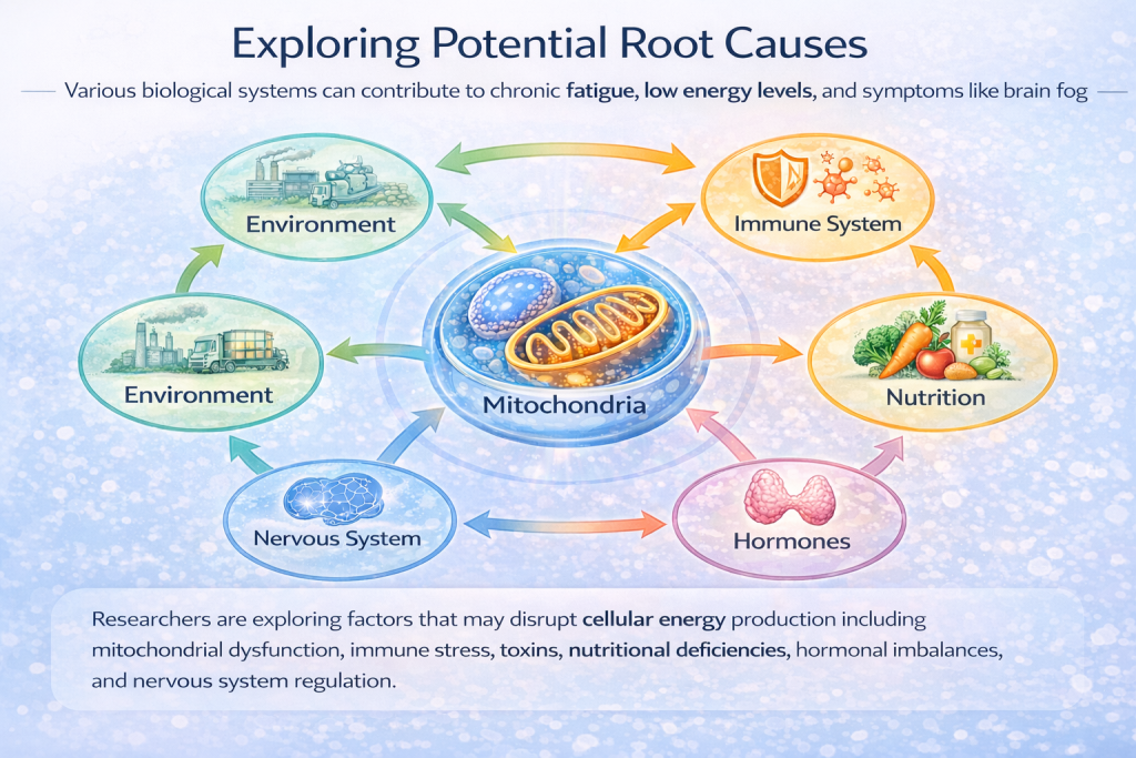 Researchers studying fatigue and mitochondrial function often look at interactions between the immune system, environmental exposures, nutrition, hormones, and nervous system regulation.